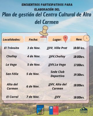 El miércoles 5 de noviembre se desarrollarán dos encuentros: el primero a las 17:00 horas en la Junta de Vecinos de La Vega y el segundo a las 19:30 horas en la sede del Club Deportivo de San Félix. Posteriormente, el jueves 6 de noviembre será el turno de la localidad de Alto del Carmen, donde la reunión se efectuará en la Junta de Vecinos a las 18:00 horas. Finalmente, el proceso concluirá el viernes 7 de noviembre con el encuentro en la Junta de Vecinos de El Corral, también a las 18:00 horas.