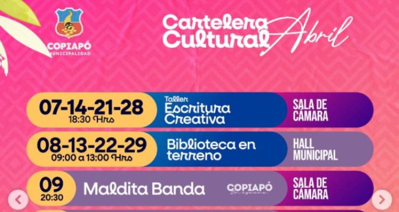 Una nutrida y diversa agenda cultural ofrecerá durante abril la Municipalidad de Copiapó, a través de su Departamento de Cultura, Turismo y Patrimonio, en el marco del Mes del Libro y la Danza.